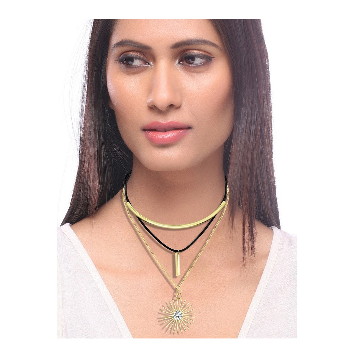 Make: Stylish And Trendy Triple Layered Necklace Covers The Entire Neck Beautifully. The Centre Piece Is 18K Gold Plated In Glossy Finish Looks Like A Choker And The Sun Shaped Charm At The Bottom Has Aaa Grade Cubic Zirconia To Add Sparkle To This Piece Along With The Contrast Of Black Leather.