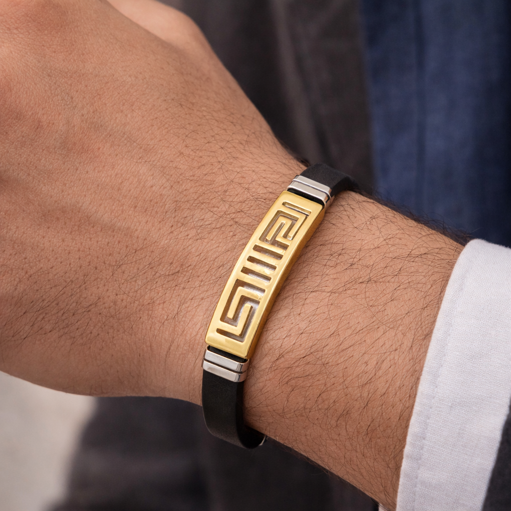 Add a touch of bold elegance to your everyday style with this Black Greek Key Pattern Bracelet. Designed with a sleek black band and a striking gold-plated Greek key motif, this bracelet blends modern luxury with timeless symbolism. Perfect for daily wear or statement styling, it offers durability, comfort, and effortless sophistication.