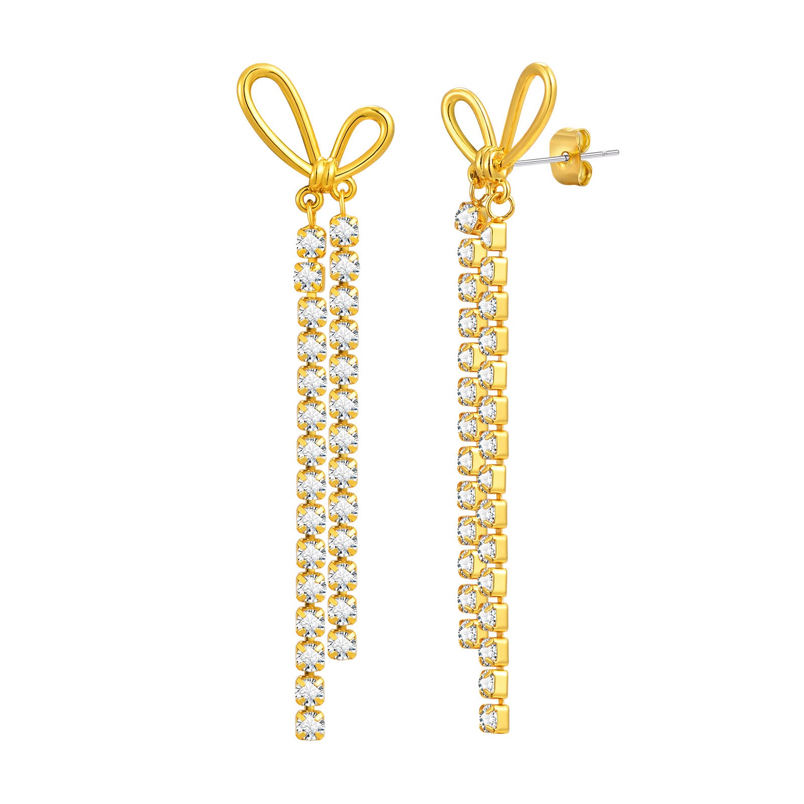 Add a touch of elegance to your look with these Bow Design Gold Plated CZ Drop Earrings. Crafted from premium stainless steel and finished with sparkling cubic zirconia stones, these earrings feature a delicate bow motif with cascading CZ drops that shine beautifully. Perfect for parties, weddings, and everyday glam.