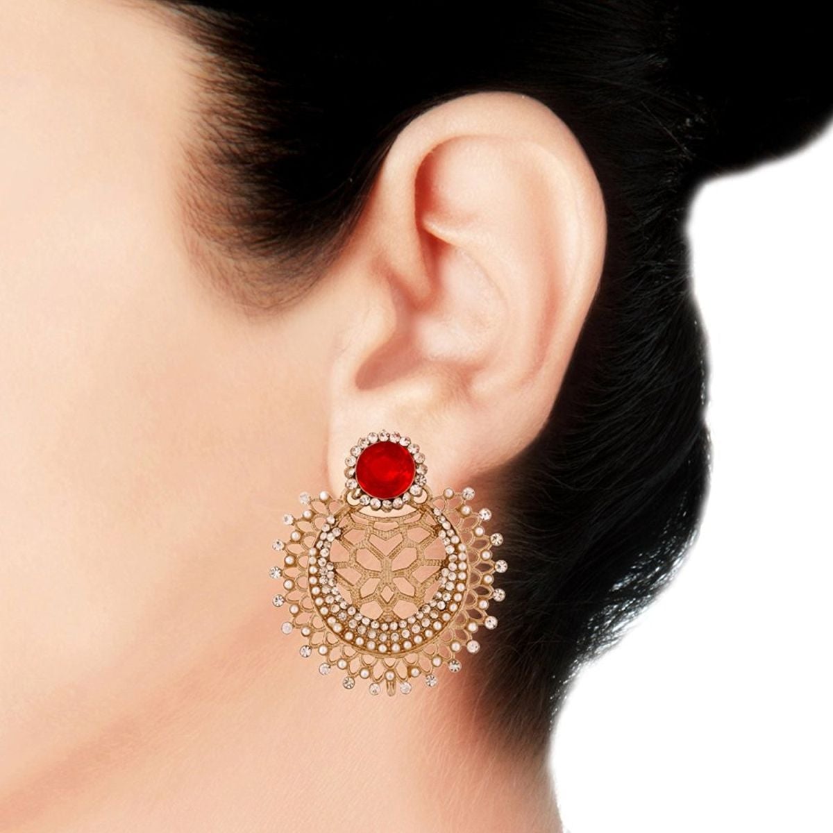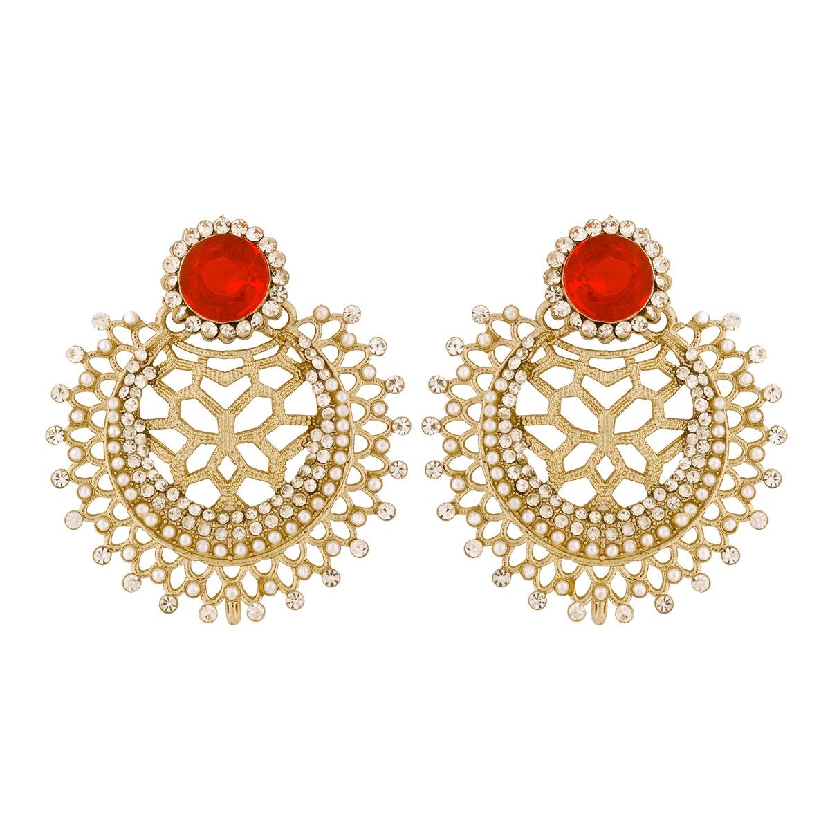 Design: Classic Filigree Design, Studded With Delicate Pearls,American Diamonds And Ruby Simulants.