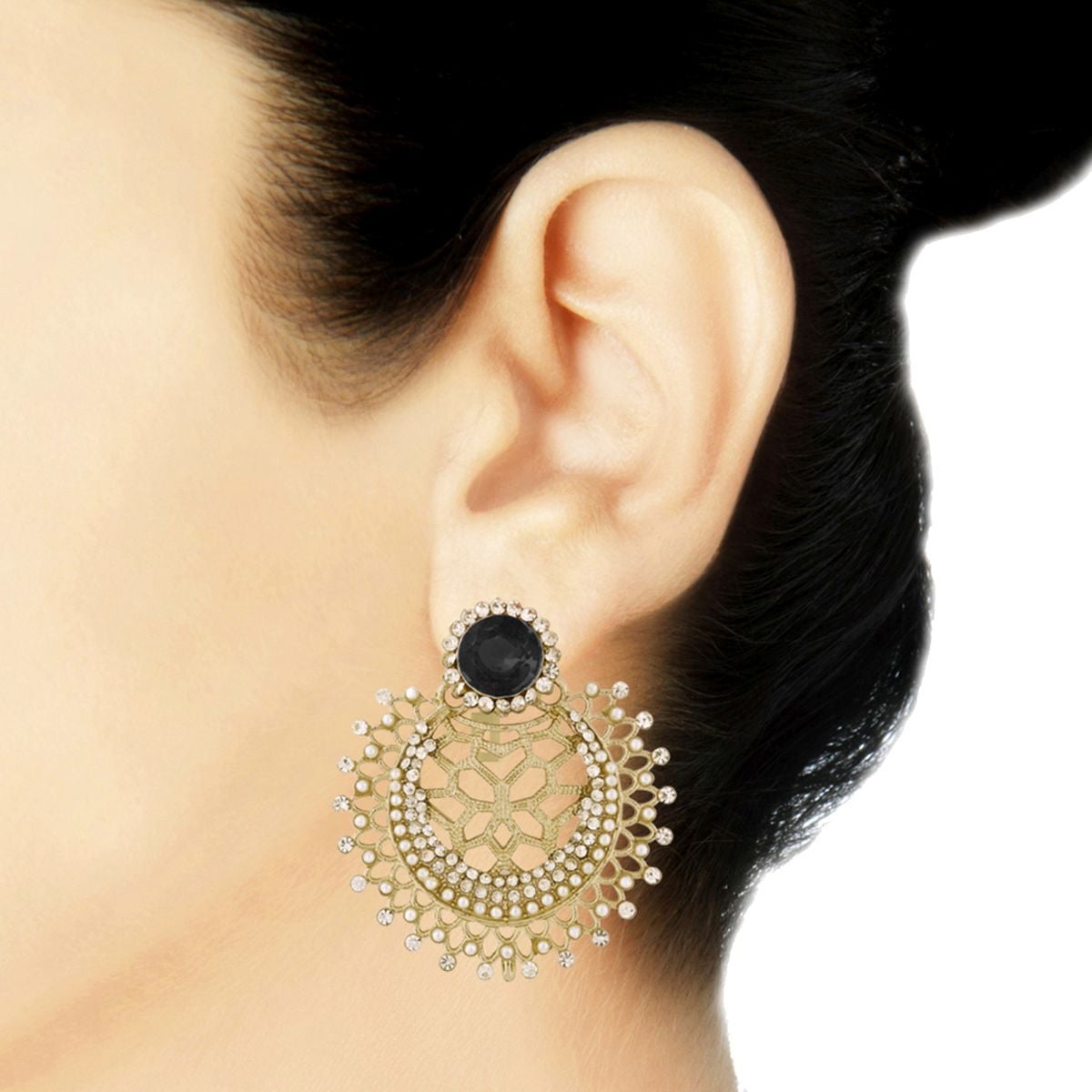 Design: Classic Filigree Design, Studded With Delicate Pearls,American Diamonds And Black Spinel Simulants.