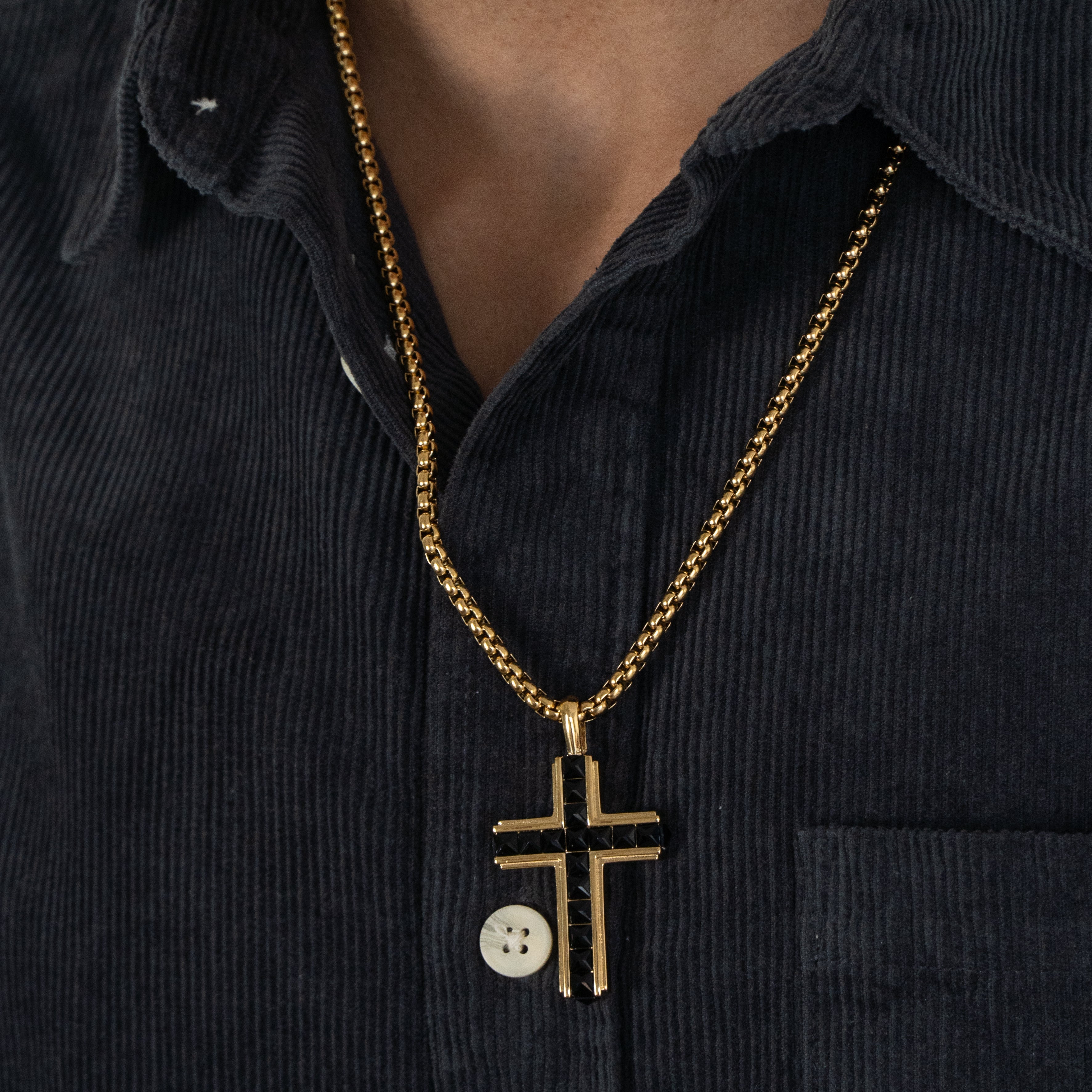 Power Cross Unisex Necklace is a bold and smart design that's not afraid to steal the spotlight! It is a gold chain with a solid gold cross pendant and black crystal embellishment. Rock it with your favorite tee or layer it up with other chains to show off your unique style. Because why blend in when you were born to stand out?