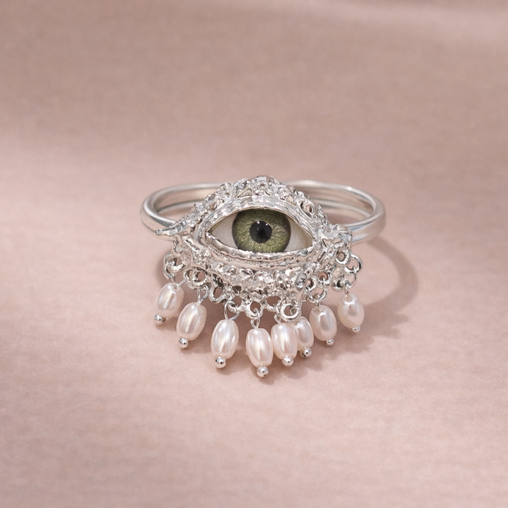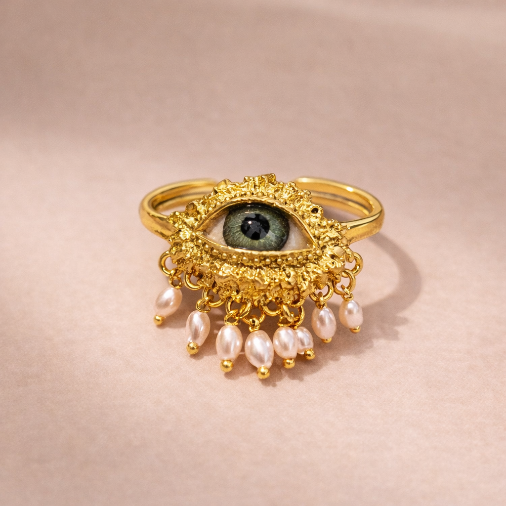 Make a bold yet meaningful style statement with this stunning evil eye ring, designed to combine protection symbolism with modern elegance. Featuring an eye-shaped motif accented with delicate pearl beads and finished in a luxurious gold and silver plated dual-tone look, this ring stands out effortlessly. Crafted from an anti-tarnish alloy base with an adjustable band, it ensures comfort, durability, and eye-catching appeal—perfect for parties, festive wear, and fashion-forward styling.