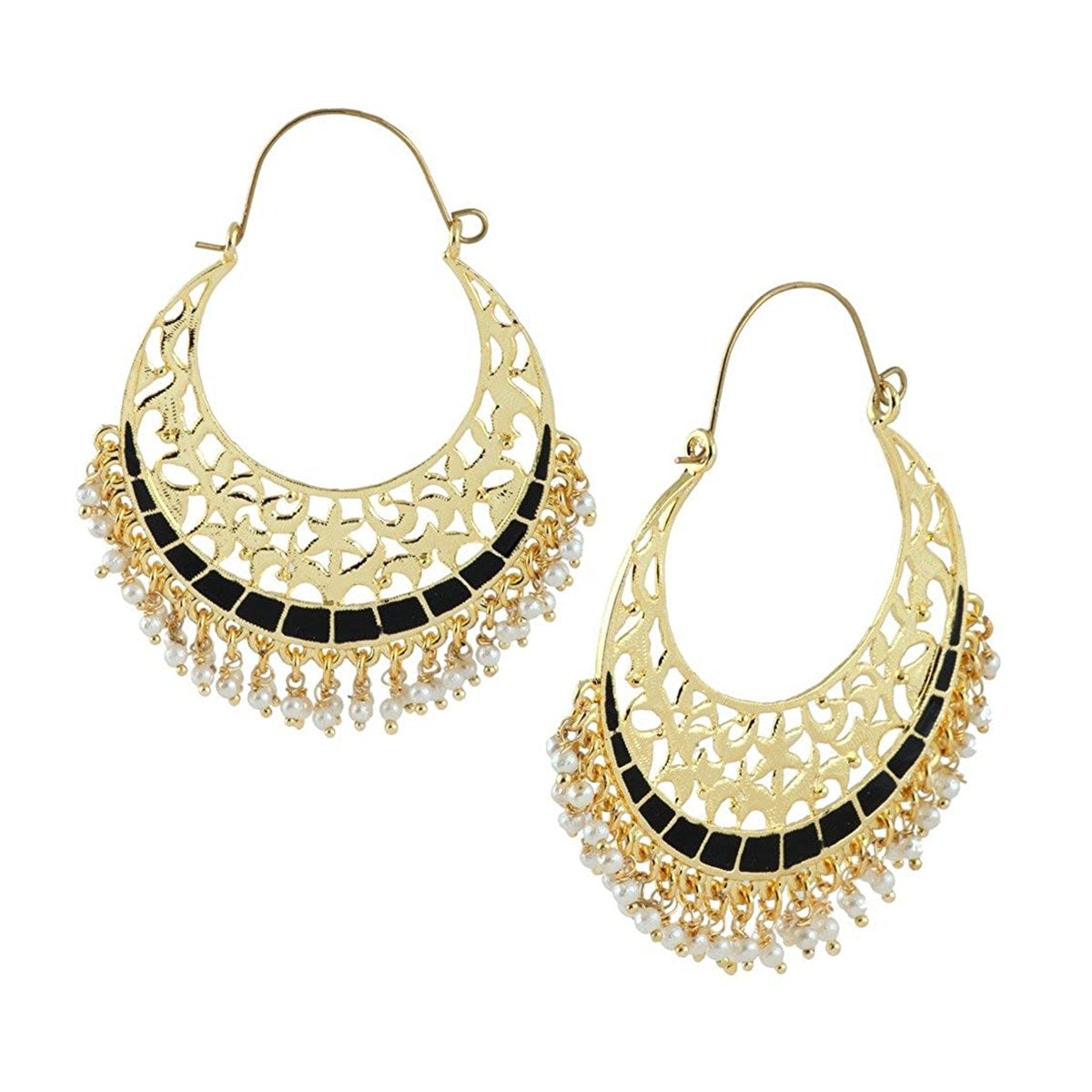 Design: Classic Large Chaand Bali Hoop In Antique Filigree Work, Adorned With Black Meenakari And Pearls.
