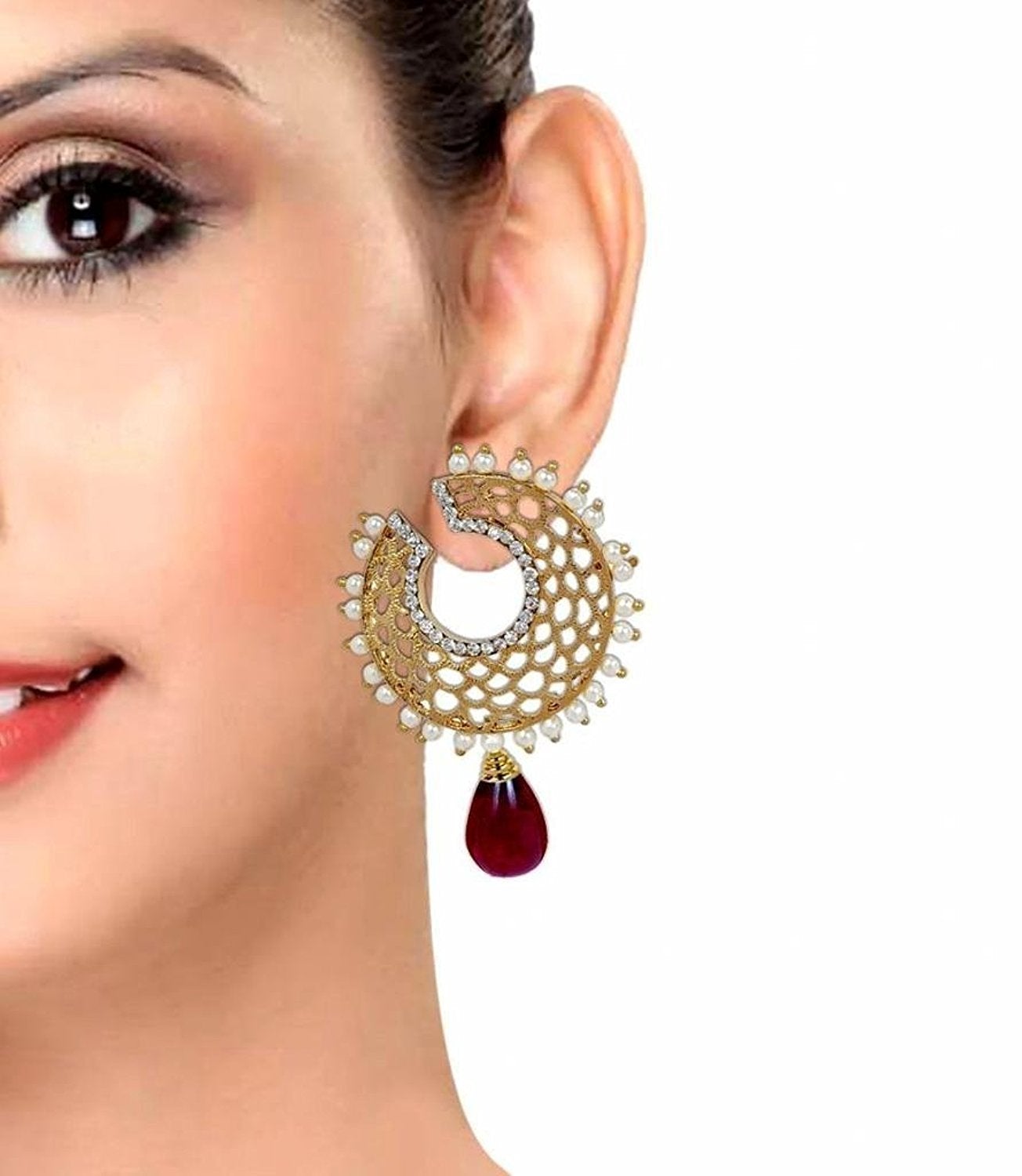 Design: Classic Crescent Or Chaand Bali Design In Handcrafted Filigree Work,Adorned With Pearls And Garnet Maroon Dangling Drop.