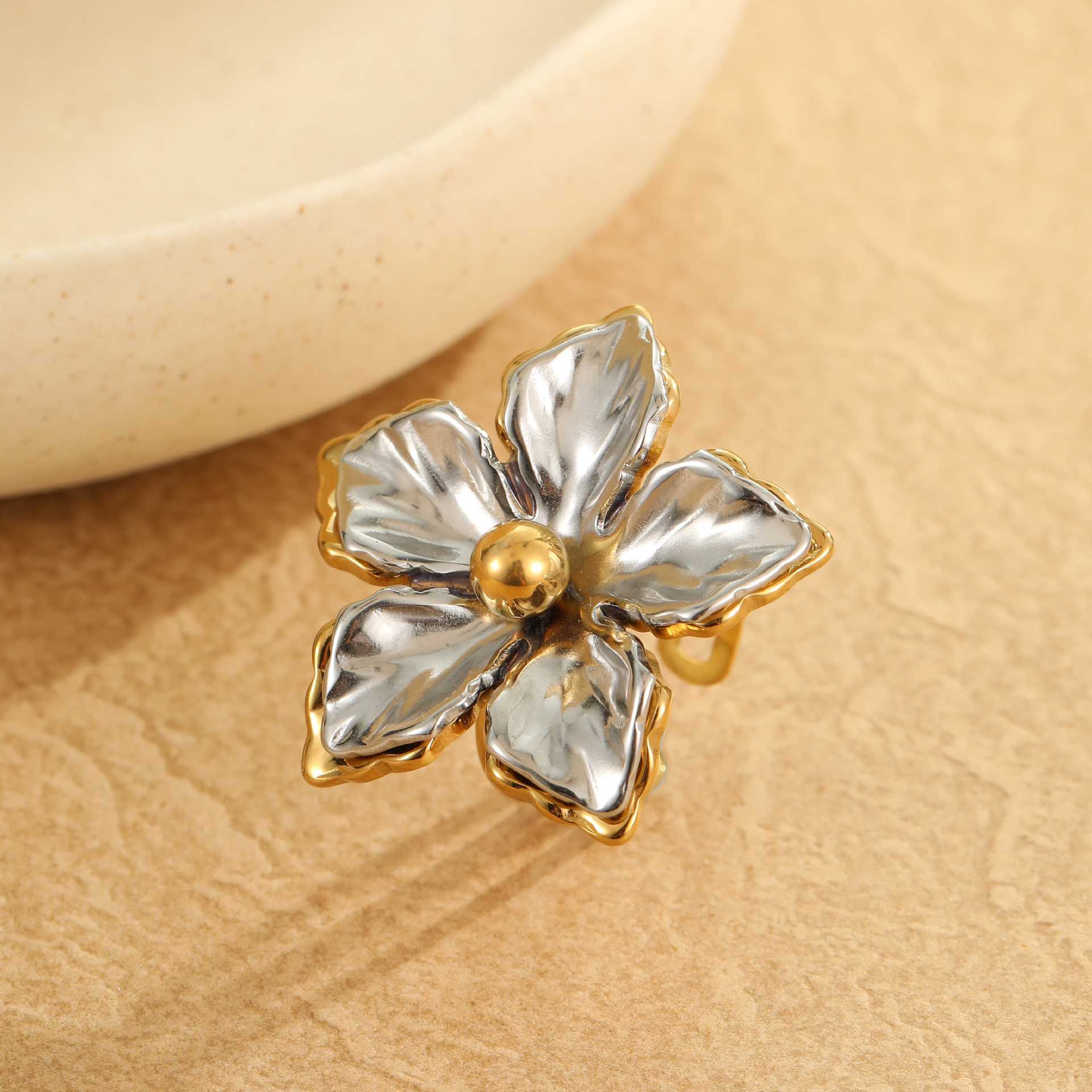 A stunning dual-tone 18K gold & silver floral adjustable ring crafted in premium stainless steel with an anti-tarnish finish. Perfect for adding elegance to any outfit.