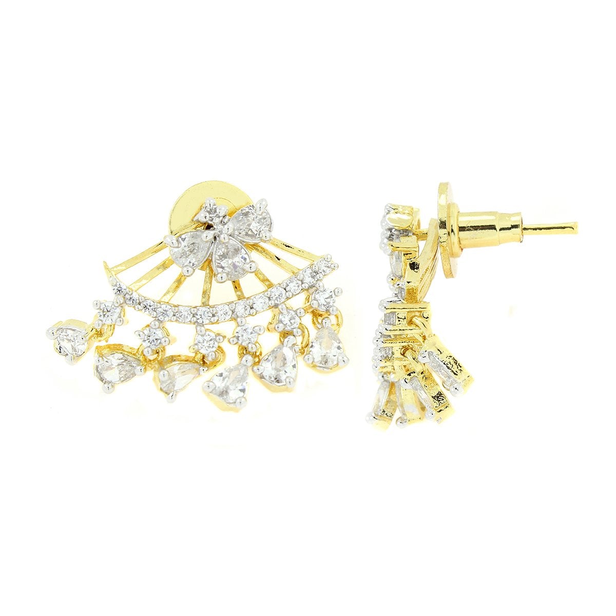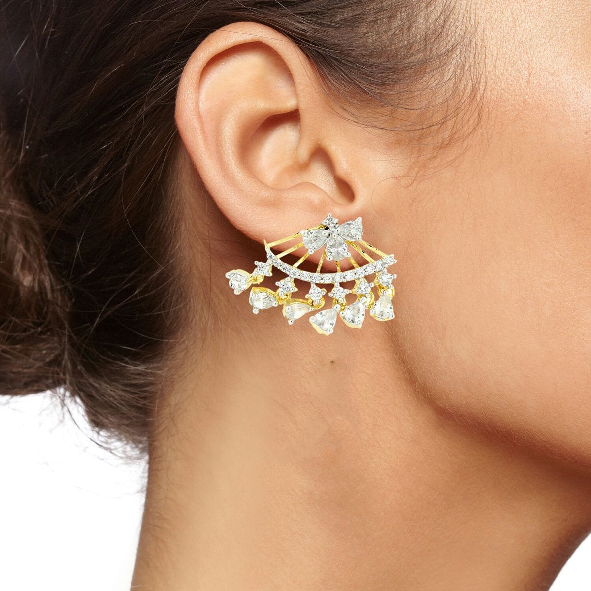 Design: Dainty Floral Design Studded With Pear Shaped American Diamonds And Rounds In Prong Setting By Skilled Bengali Artisans. The Dangling Stones Gracefully Sit At The Bottom Of The Ear Lobe Ensuring A Delicate Look.