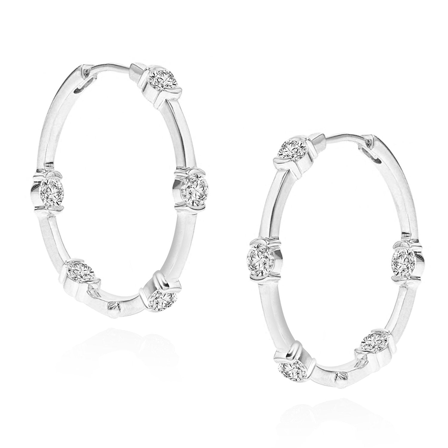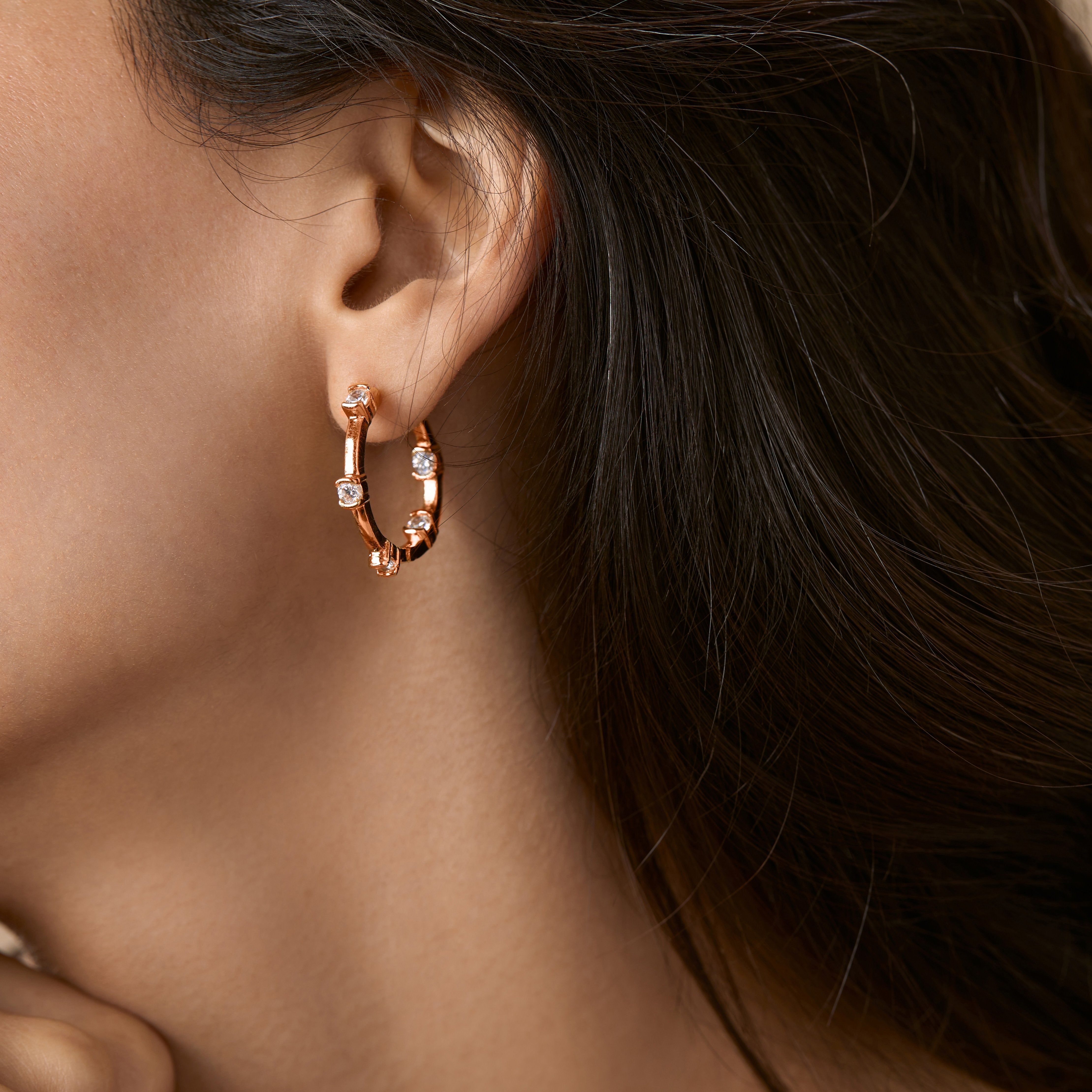 These ZIVOM earrings are decorated with round-cut crystals that are strategically placed on both the inner and outer portions of each hoop to make the most impact. They're cast from a master alloy, plated with 18 kt rose gold and have hollow bezel settings which allow light to come through for enhanced sparkle.