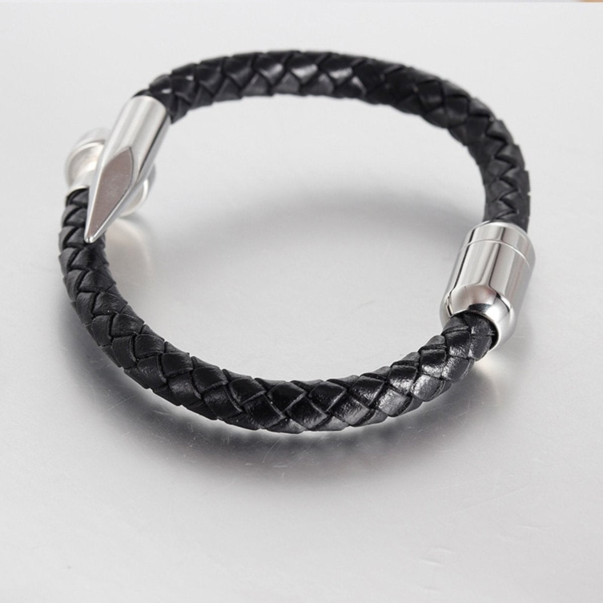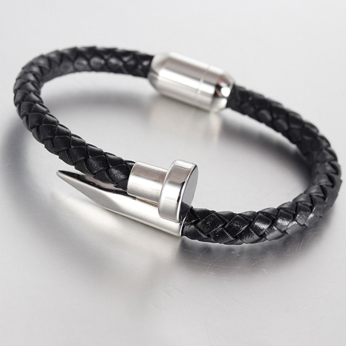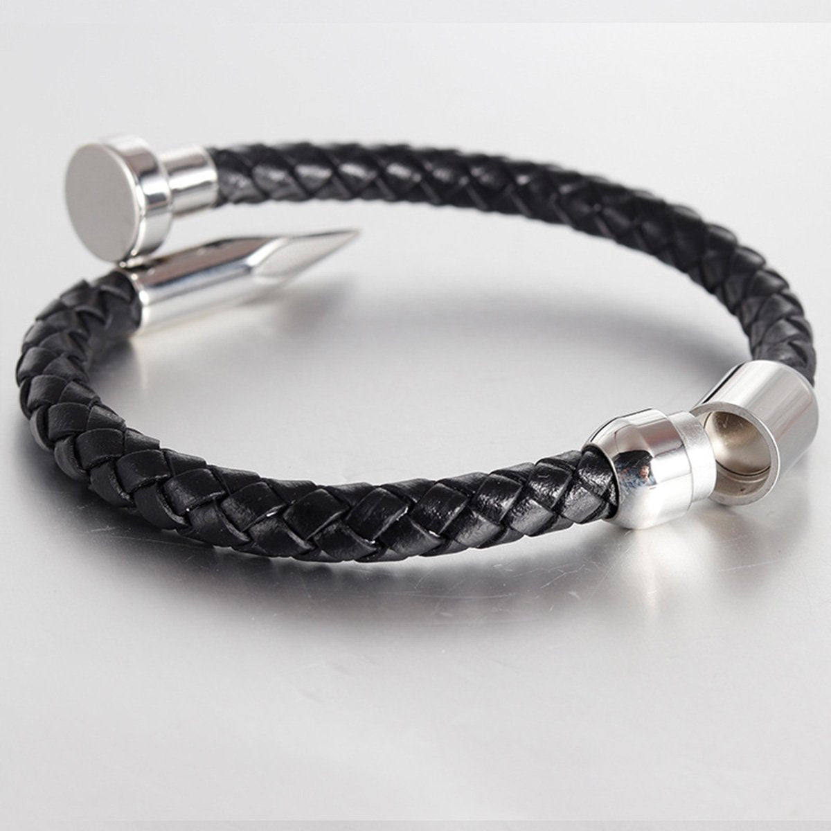 Make: Classic Gothic Nail Design Built with 316L Grade Surgical Stainless Steel, Rhodium Plated. Handcrafted 100% Genuine Braided Dark Brown, Soft Yet Durable Leather