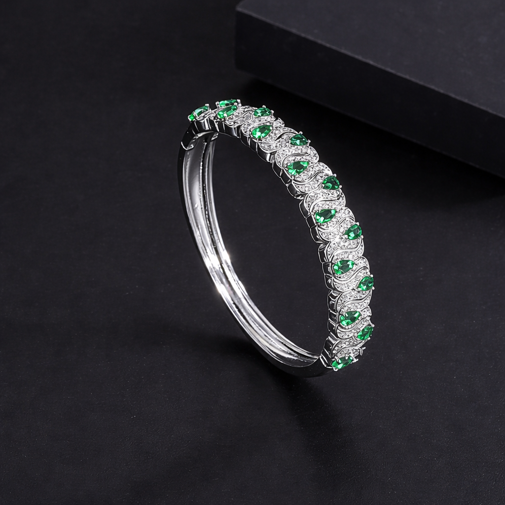 Make a bold style statement with this green and red designer style silver plated CZ cuff & kada. Crafted in anti-tarnish brass and finished with sparkling cubic zirconia stones, this elegant piece blends luxury with everyday wear comfort—perfect for festive occasions, parties, or special gifting.