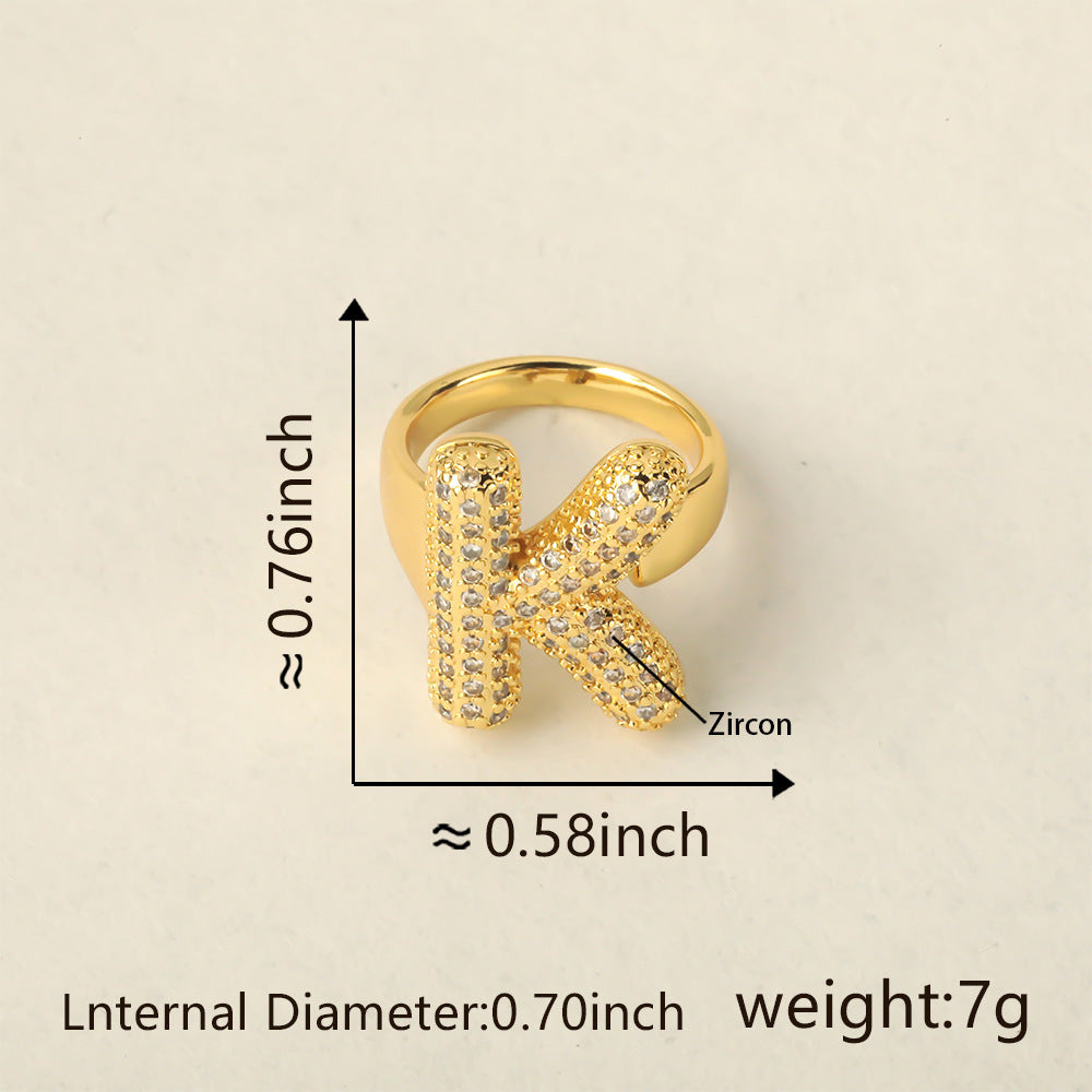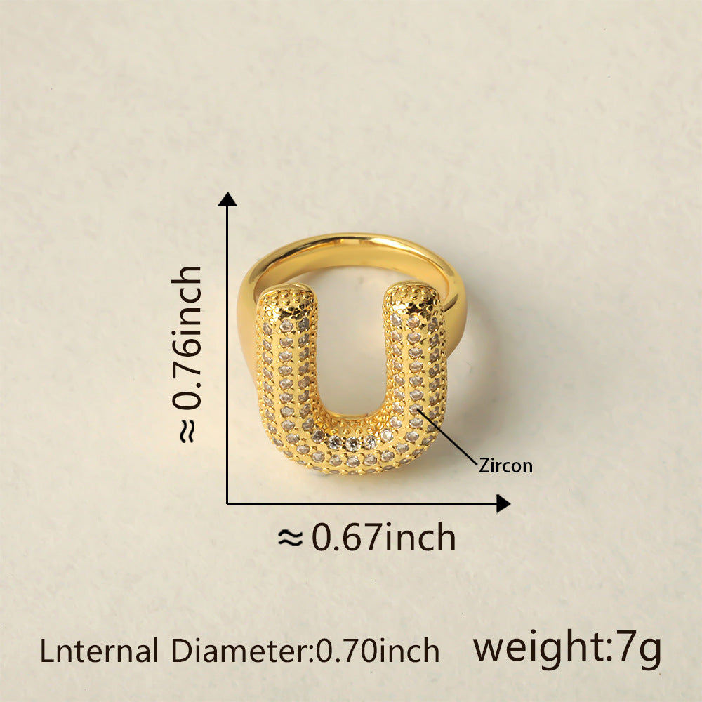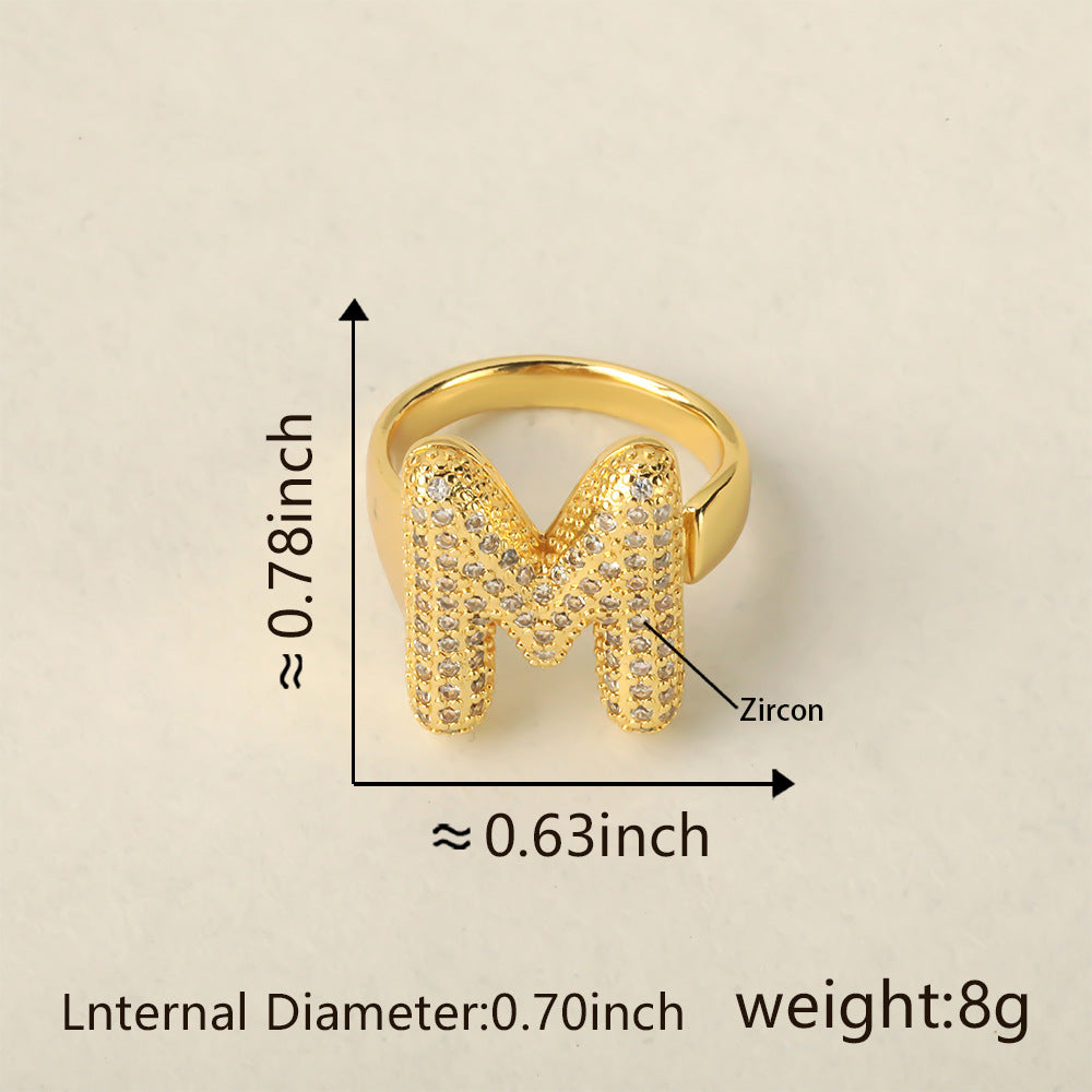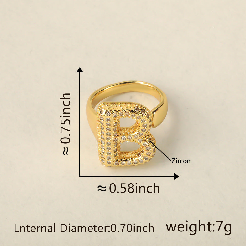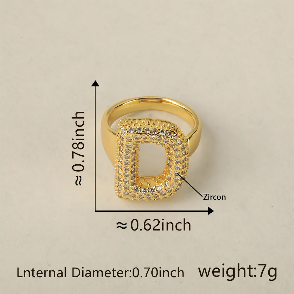 Each ring features a stylishly sculpted alphabet letter, intricately adorned with high-quality cubic zirconia stones for a dazzling diamond-like brilliance. The 18K gold-plated finish offers a rich, luxurious glow while maintaining comfort and durability.