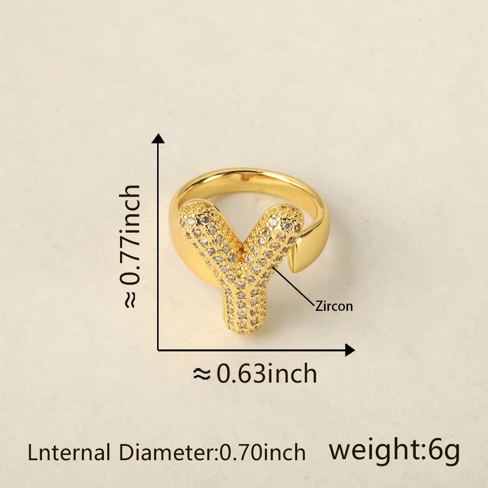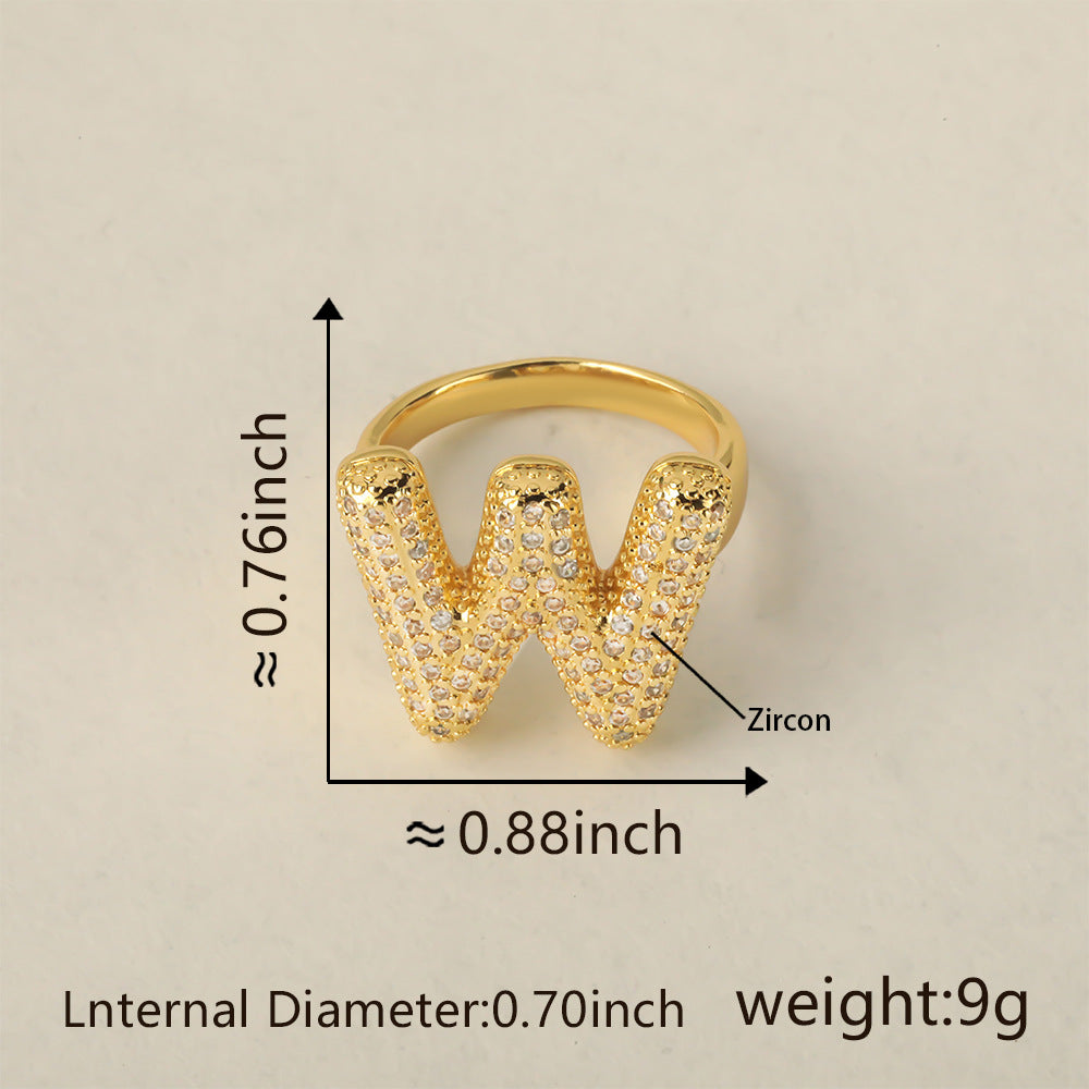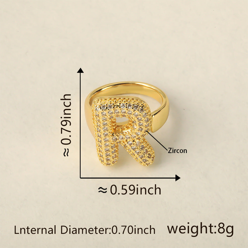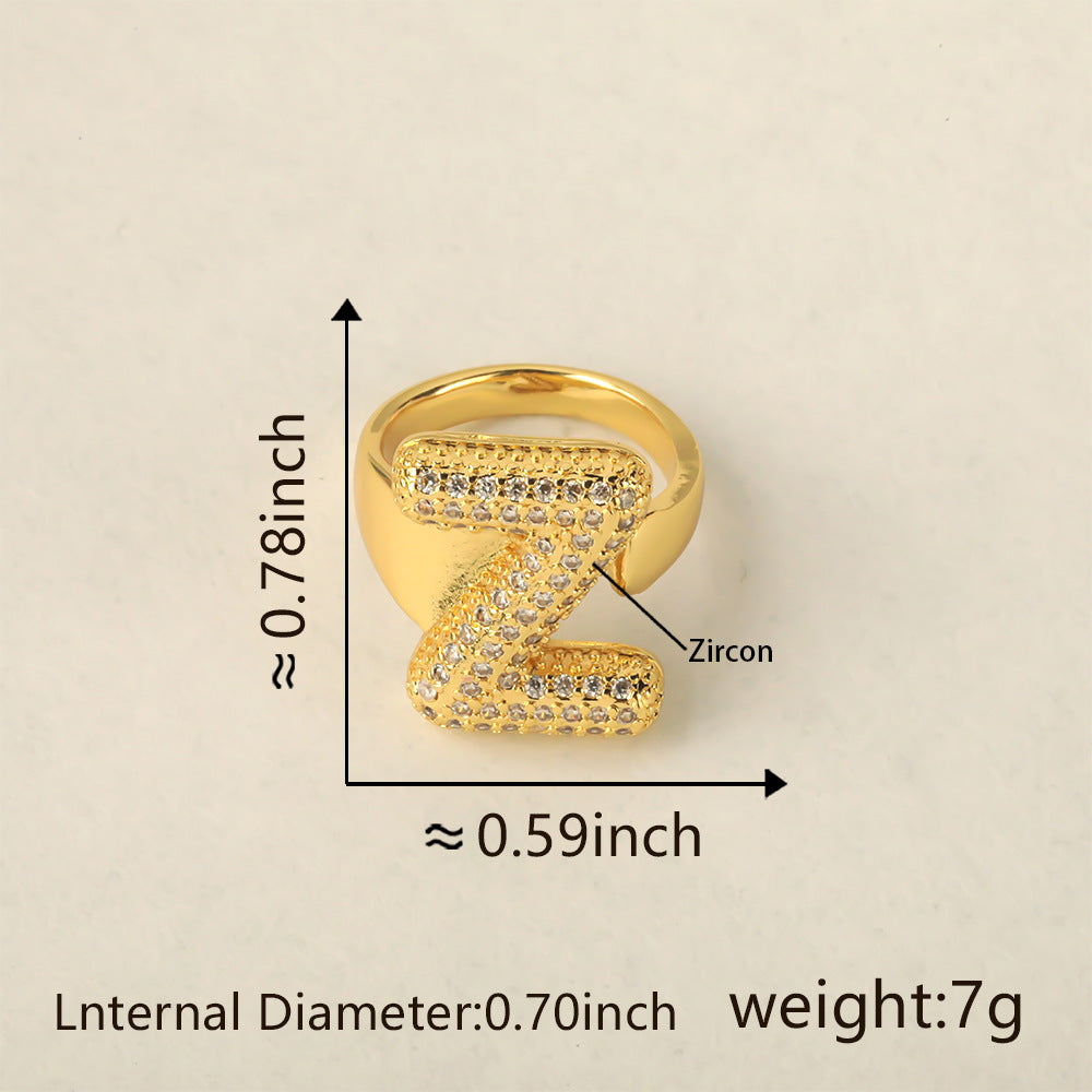 Each ring features a stylishly sculpted alphabet letter, intricately adorned with high-quality cubic zirconia stones for a dazzling diamond-like brilliance. The 18K gold-plated finish offers a rich, luxurious glow while maintaining comfort and durability.