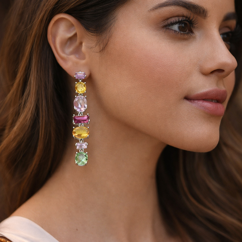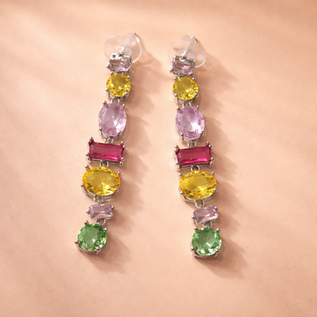 Make a bold yet elegant style statement with these multi color stone vertical bar dangler earrings. Designed with sparkling cubic zirconia stones set in a sleek vertical arrangement, these earrings feature premium gold plating on a durable copper base. Perfect for parties, festive occasions, and evening wear, they add a pop of color and modern sophistication to any outfit.