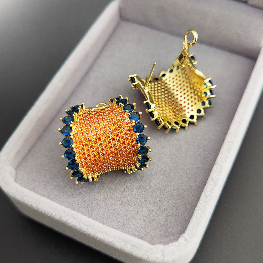Make a bold style statement with these stunning Orange Blue Gold Cubic Zirconia Anti Tarnish Copper Stud Earrings Designed with a vibrant orange micro-pave CZ center and bordered with deep blue teardrop stones, these earrings add an instant pop of glamour to any outfit. The rich gold-plated base enhances the contrast, making them perfect for festive wear, parties, weddings, and fashion-forward everyday styling. Lightweight yet eye-catching, these earrings deliver the perfect blend of colour, sparkle, and elegance.