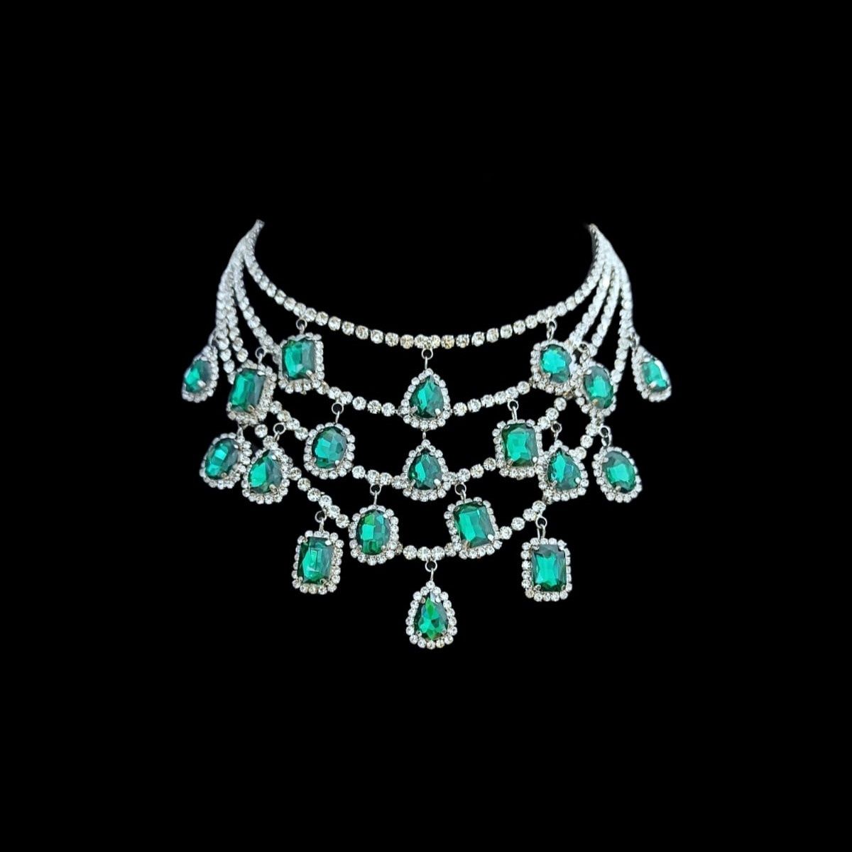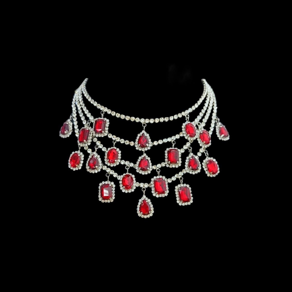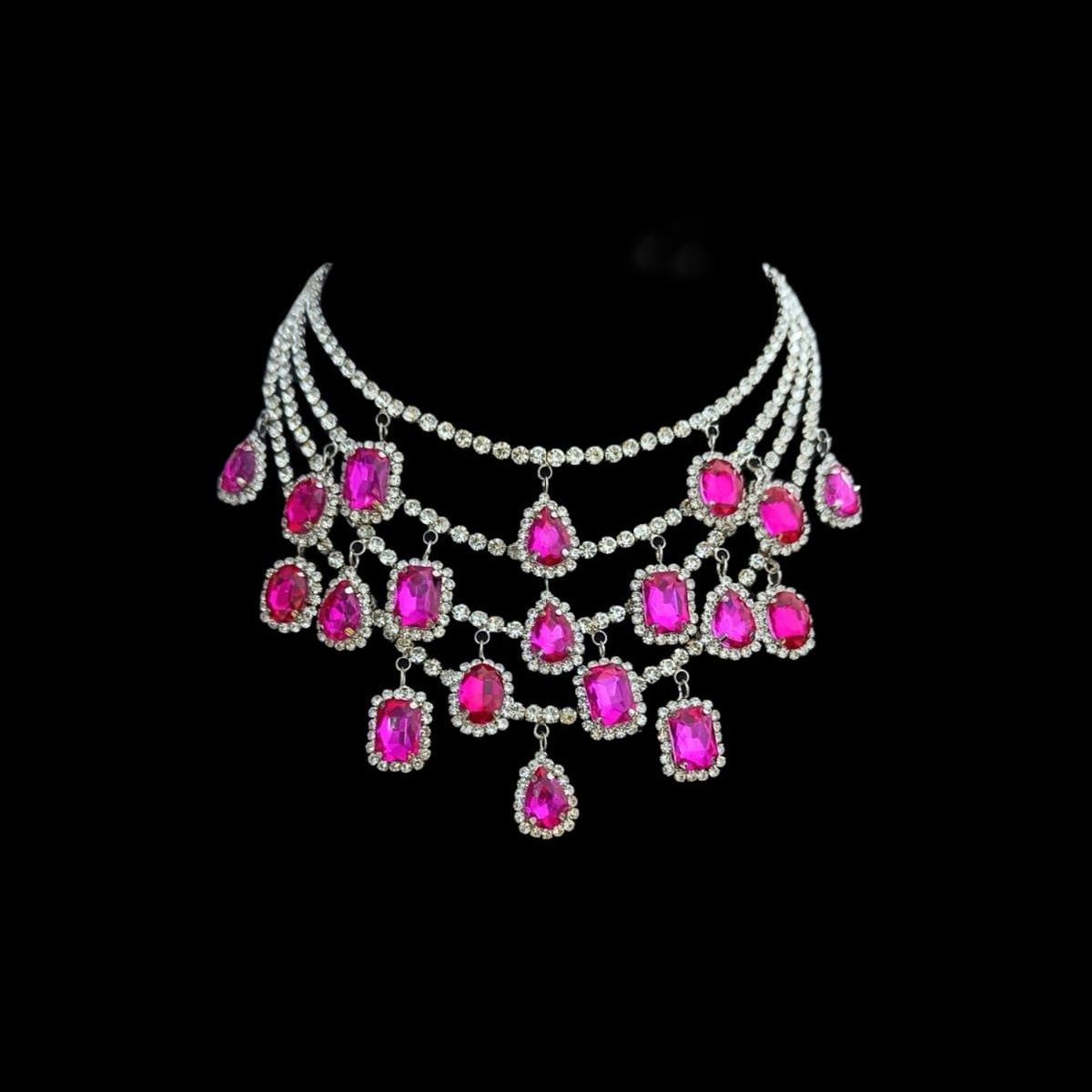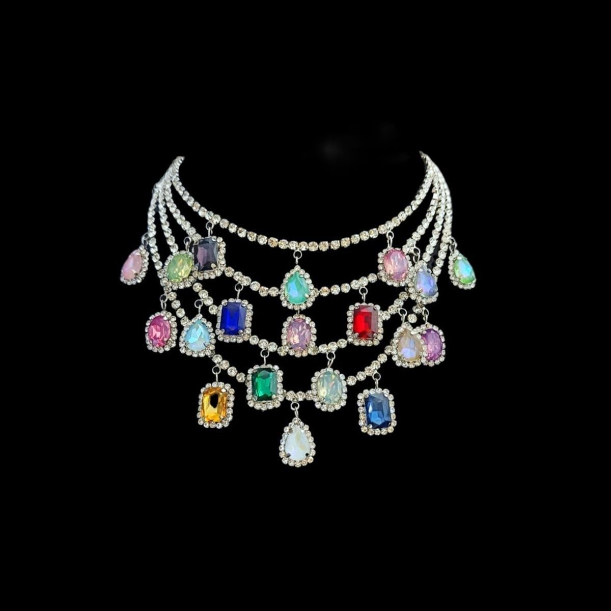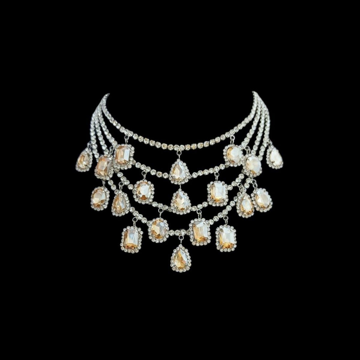 Ruhana Necklace Shimmering With Clear Stones In A Mesmerizing Layer Of Crystal Brilliance. This Layered Necklace Features Multiple Shape Cut Stones Along Rhodium Plated Ziconia Chains And Sets Perfectly On Your Neckline. Refined And Royal, This Necklace Can Be Worn With Endless Versatility.