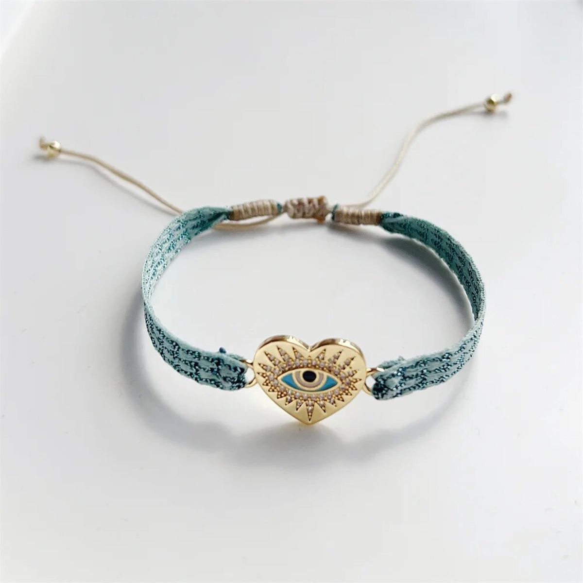 Elegant And Symbolic Piece Of Jewelry. It Features A Delicate Adjustable Thread Band Adorned With Both A Heart-Shaped Design And The Protective Evil Eye Motif. Crafted With 18K Gold Plating, This Bracelet Combines A Sense Of Sophistication With A Touch Of Mystique. The Combination Of The Heart And Evil Eye Symbolism Adds Depth And Meaning To The Accessory, Making It A Stylish And Meaningful Addition To Any Woman's Ensemble.