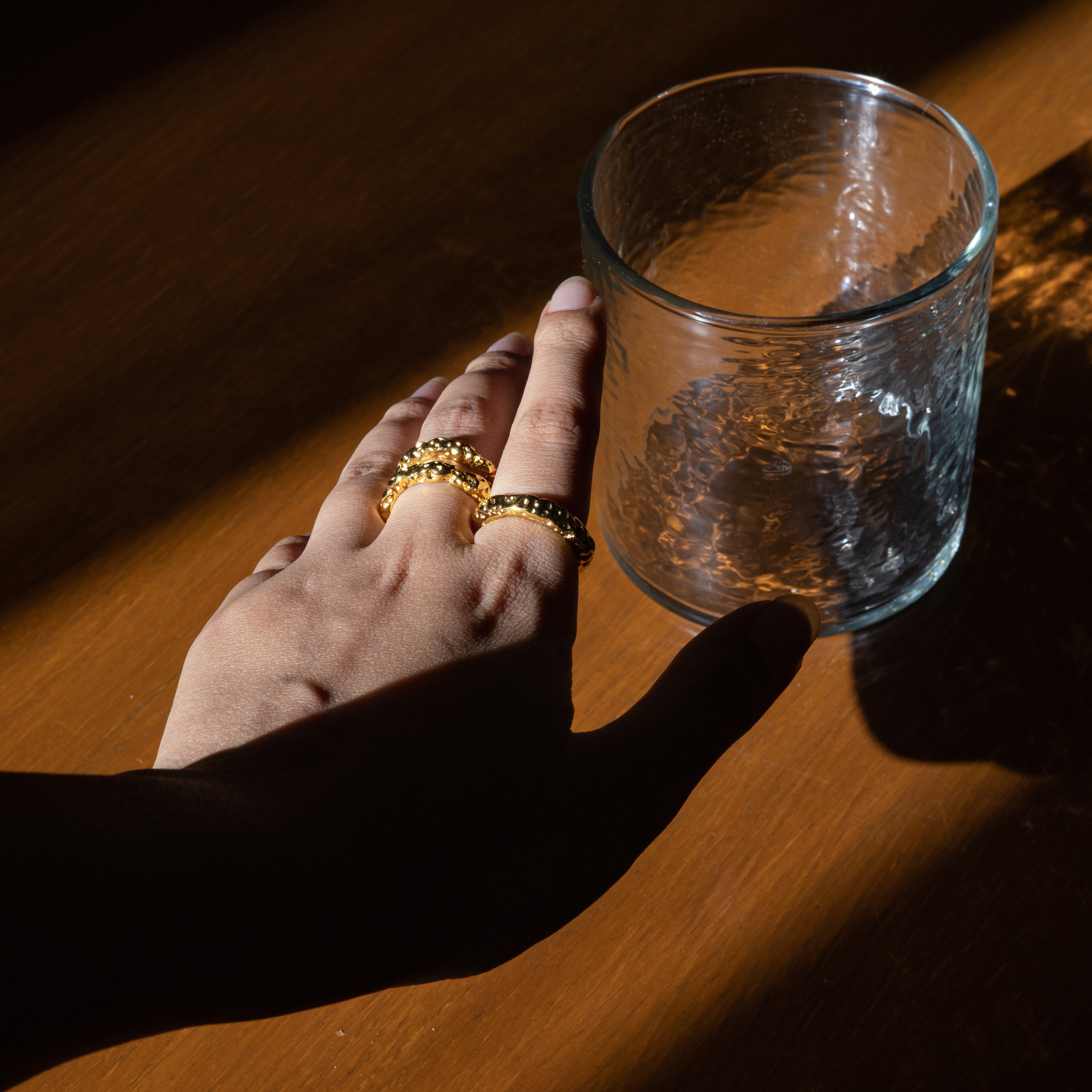 Rustic Romance Rings are a Set of 2 textured rings, one conjoined and the other single. The rings can be worn stacked together, paired with other jewelry, or worn individually. They pair beautifully with boho looks and solid color-blocked outfits.