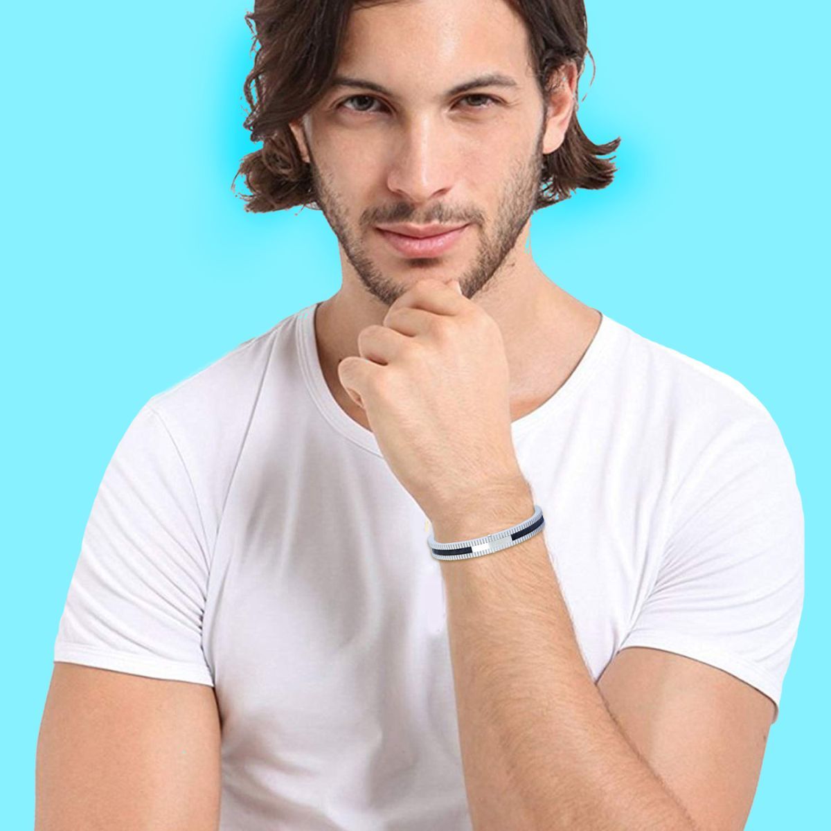 Make: Built With Skin Friendly (Hypo-Allergenic) 316L Surgical Stainless Steel.Highly Durable & Low Maintenance: Resistant To Rust, Oxidation & Discolouration, Ideal For Daily Wear In Humid Conditions. Bracelet Will Never Rust In Water, But Its Recommended To Remove Before Bath So That Plating Doesnt Erode Over Time. Classic Black Accents Add To The Premiumness Of The Bracelet.