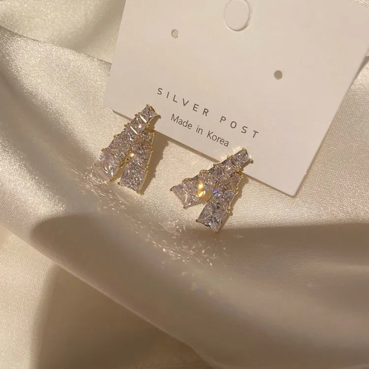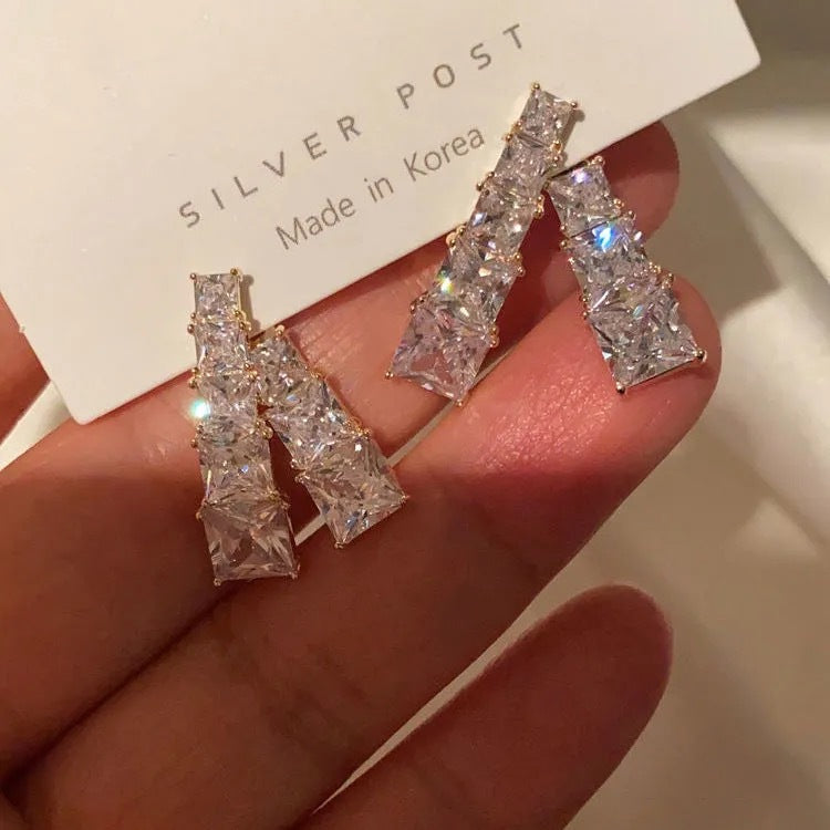 Add a touch of refined brilliance to your look with these Silver Gold Plated Cubic Zirconia Rhinestone Alloy Earrings. Designed with a modern geometric silhouette, each earring features multiple high-clarity cubic zirconia stones arranged in a cascading formation that catches the light beautifully from every angle. The gold-tone finish enhances the sparkle, offering an elegant contrast that makes these earrings perfect for both everyday sophistication and special occasions. Lightweight and comfortable, they provide a chic and luxurious statement without overpowering your style.
