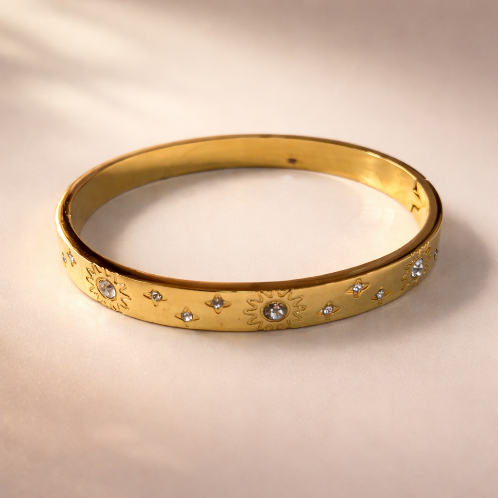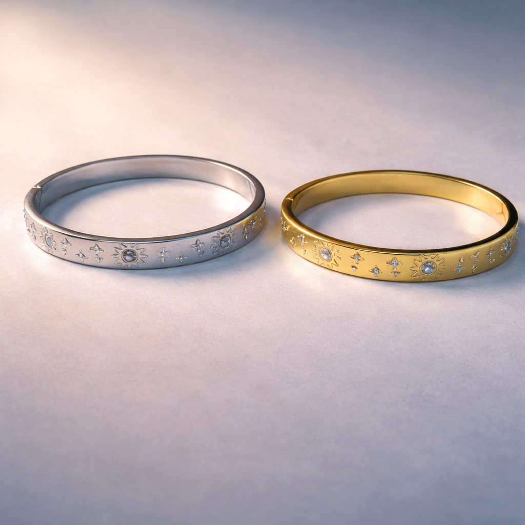 Add a touch of celestial elegance to your everyday style with this Sun Pattern Gold & Silver Plated CZ Cuff & Kada. Designed with delicate sun motifs and sparkling cubic zirconia stones, this modern stainless steel bangle blends minimal charm with premium craftsmanship—perfect for both daily wear and special occasions.