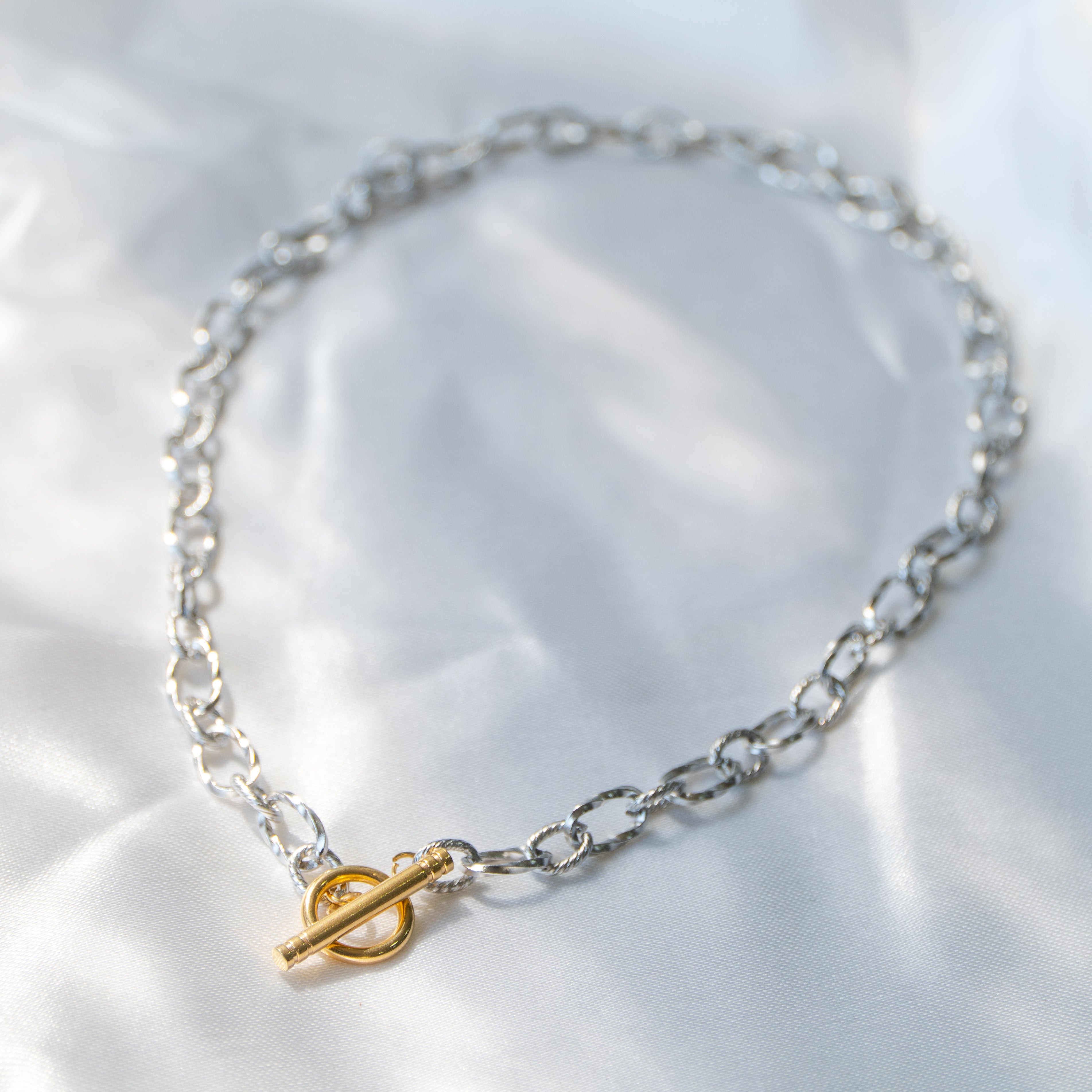 Up your street style game with the Synergy Chain Necklace. This dual-tone paperclip chain, with silver links and a golden toggle lock, adds a touch of urban-chic to your everyday look. Layer it with other chains or let it stand alone for a subtle yet impactful statement. Throw together your favorite graphic tee and jeans for an edgy appeal or pair it with a sleek blazer to add a hint of casual ease to your formals.