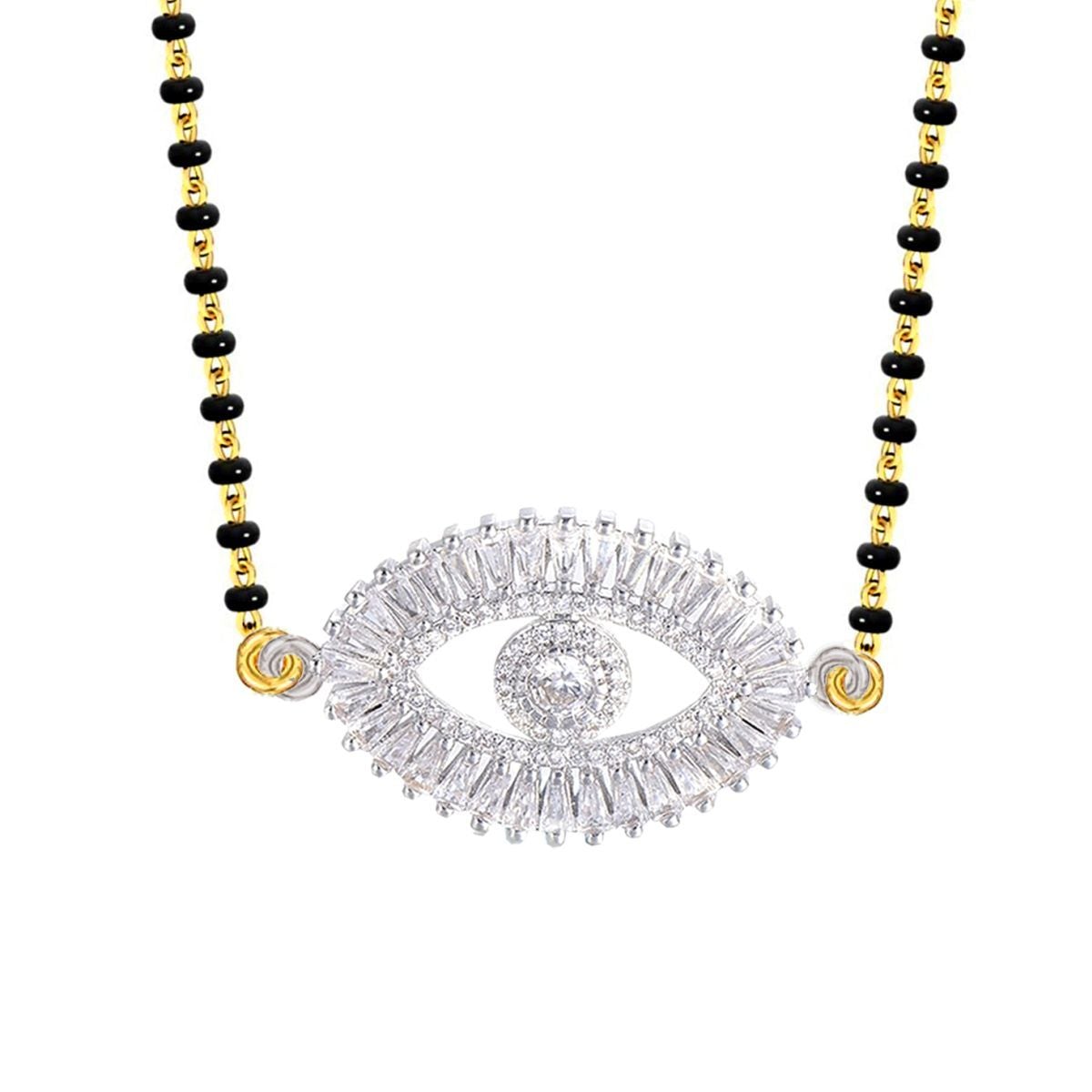 Make: Built With Skin-Friendly, Hypo-Allergenic High Quality Brass ( Not Any Ordinary Metal Or Alloy), Plated With 10 Micron Silver.American Diamonds / Cubic Zirconia: Carefully Handpicked For Uniformity Of Color,Cut,Clarity & Lustre.Black Beads of the Mangalsutra are Carefully Hand crafted together with Strong Brass Wires, By Skilled Bengali Artisans.