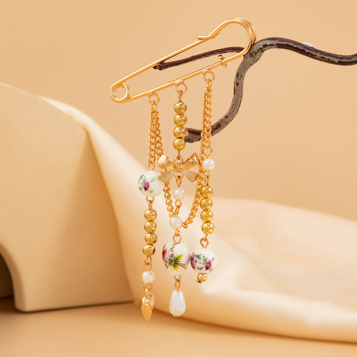 Add a touch of vintage charm to your outfit with this Vintage Safety Pin Ceramic Charm Brooch. Designed with a classic safety pin base, this unique piece features delicate ceramic floral beads, gold-tone accents, pearls, and playful dangling charms that create a beautifully layered look.