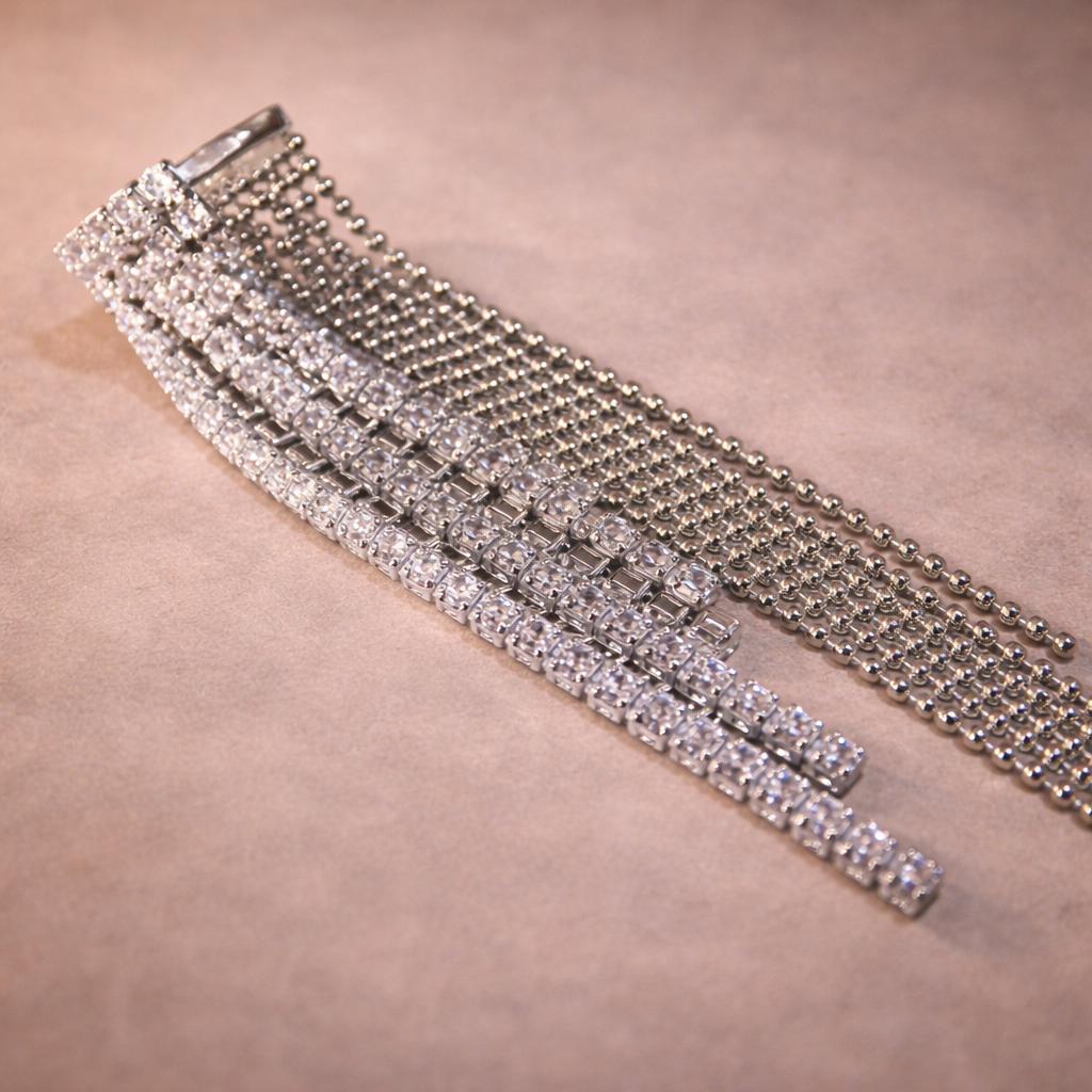Add instant glamour to your look with these White Multi Chain Silver Plated Rhinestone Ear Cuff Earrings. Designed to make a bold yet elegant statement, this modern ear cuff style combines sparkling rhinestones with fluid multi-chain detailing—perfect for parties, evenings, and fashion-forward styling.